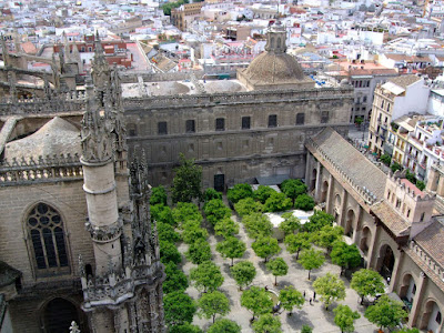 下午則是去了另一個大景點Cathedral and its Giralda Tower,總之就是一個本來要蓋清真寺後來因為穆斯林輸了,天主教的人來了就改成教堂囉。而這個塔本身除了雕飾華麗之外,上塔是走斜坡而不是走樓梯,據說是因為當初有考慮到騎馬上塔。外觀是豐富的花草雕飾,內部則有管風琴、耶穌像等等的文物,最有名的是哥倫布的靈柩也在這裡。在發現美洲以後,Sevilla成了很重要的一個與新世界的貿易城市,大概是因為這樣所以哥倫布在這裡?
